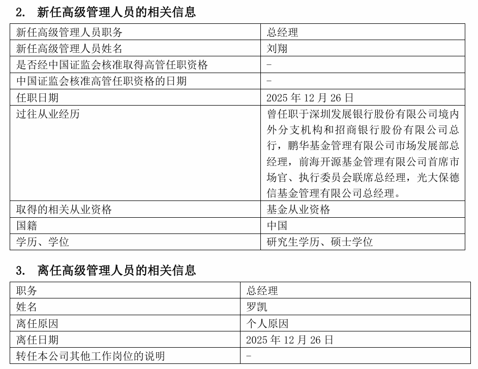 2025年12月26日,诺德基金发布高级管理人员变更公告。该公告显示,刘翔自当日起新任该公司总经理,同日,罗凯因个人原因离任总经理一职。