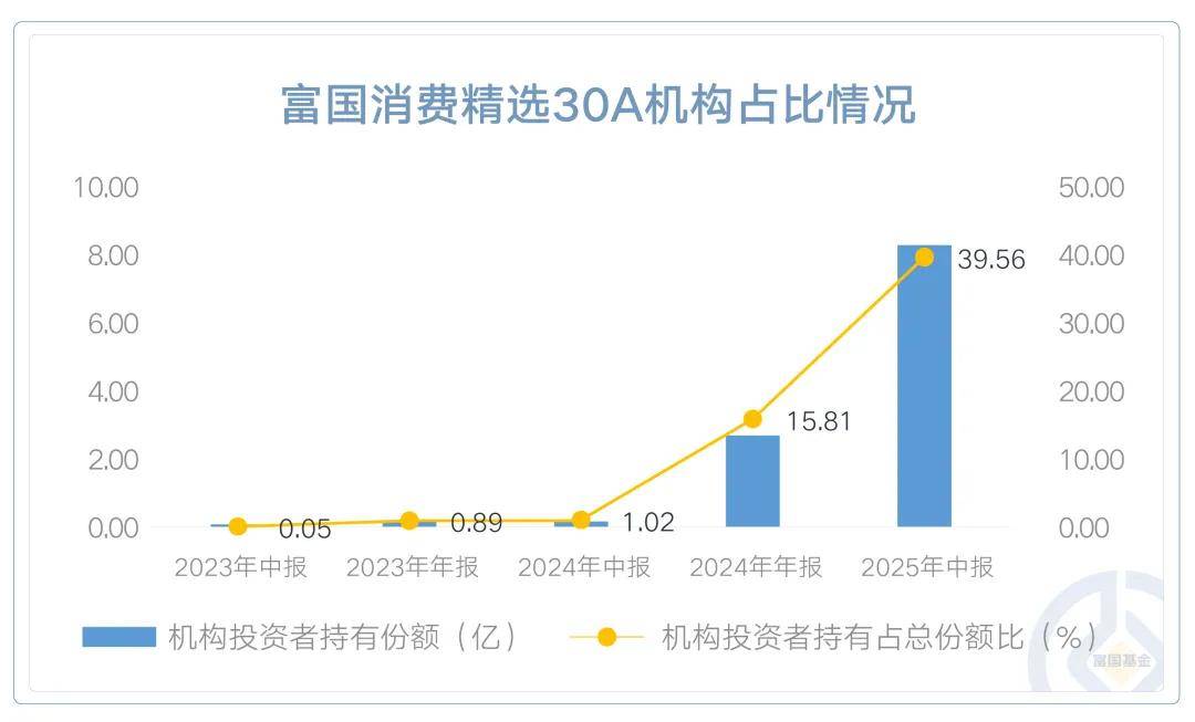 毫无疑问,富国消费精选30这一突出表现获得了多类资金的青睐。根据2025年基金中报,A类份额的机构持有自2023年中报的0.01亿份已增长至8.26亿份,占比达39.56%;C类份额机构持有增长至16.20亿份。