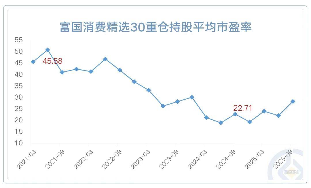 数据来源:富国消费精选30股票基金定期报告,Wind,截至2025年9月30日,重仓持股市盈率 = Sum(季报披露重仓股票市值)/Sum(季报归属母公司股东的净利润(TTM)*个股持仓市值/个股总市值;上述内容仅代表基金特定时点配置情况,仅用作举例说明,不预示本基金未来投资配置。市场有风险,投资需谨慎。定期报告披露内容为时点数据,不必然代表各期报告期间的持仓情况与披露情况一致。