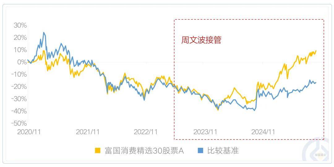 注:基金同类排名数据来自银河证券,富国消费精选30股票A同类为消费行业股票型基金(A类),截至2025/11/30。基金评价结果基于基金和管理人过往表现综合判定,并不构成对基金管理人或单只产品的未来投资建议。富国消费精选30股票A净值、业绩比较基准及业绩走势图来自基金定期报告,截至2025/09/30,历史业绩不代表未来,基金有风险,投资需谨慎。富国消费精选30股票A业绩走势图来自基金定期报告,截至2025/09/30。富国消费精选30股票A成立于2020/11/05,业绩比较基准为中证消费服务领先指数收益率*65%+中证港股通大消费主题指数收益率*20%+中债综合全价指数收益率*15%。近4个完整年度(2021-2024)的基金份额净值增长率(及同期业绩比较基准收益率)为-4.52%(-10.89%),-16.41%(-18.1%),-16.15%(-14.09%),17.13%(6.49%),数据来自基金定期报告,截至2024/12/31。期间基金经理变动情况:王园园(2020/11/05-2024/07/08)、闫伟(2021/07/01-2023/05/16)、周文波(2023/05/19至今)。基金收益率不代表投资者实际收益率,基金份额净值仅为每份额基金产品的净资产。基金历史业绩不构成对未来业绩的保证。。