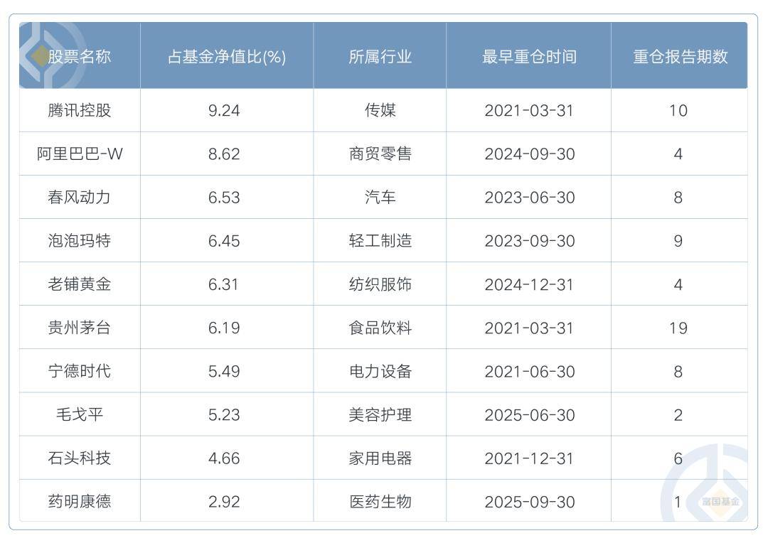 同时,自2024年来陆续加大对港股新消费的配置,截至2025年三季报,该基金前十大成分股中有5只港股标的。