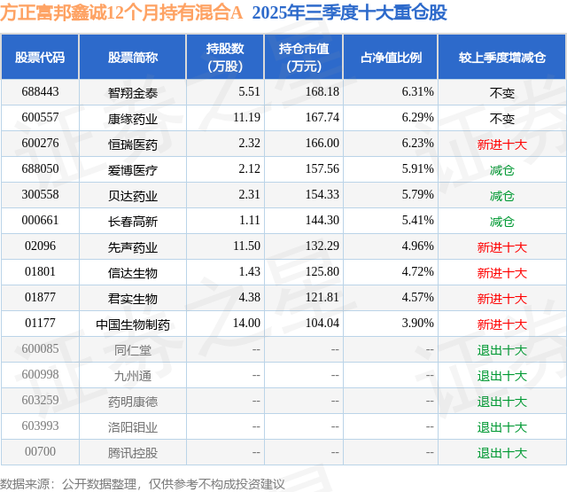 根据2025基金Q3季报公募基金重仓股数据,重仓该股的公募基金共2家,其中持有数量最多的公募基金为方正富邦基金的方正富邦鑫诚12个月持有混合A。方正富邦鑫诚12个月持有混合A目前规模为0.24亿元,最新净值1.0641(1月8日),较上一交易日上涨0.24%,近一年上涨12.05%。该公募基金现任基金经理为崔建波 郑森峰。崔建波在任的基金产品包括:方正富邦策略精选A,管理时间为2020年12月2日至今,期间收益率为6.0%;方正富邦汇福一年定开混合A,管理时间为2021年3月24日至今,期间收益率为-5.58%;方正富邦趋势领航混合A,管理时间为2021年9月23日至今,期间收益率为-3.82%;方正富邦策略轮动混合A,管理时间为2021年11月12日至今,期间收益率为-3.84%。