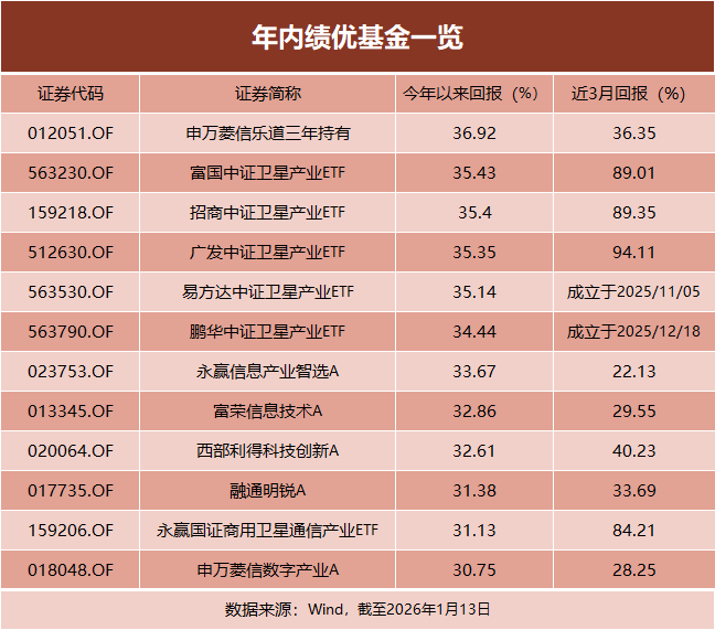 2026年,A股市场迎来强劲开局,基金赚钱效应良好。Wind数据显示,截至1月13日,全市场已有103只基金(仅统计主基金)年内回报超20%,其中12只基金(仅统计主基金)年内回报超30%。