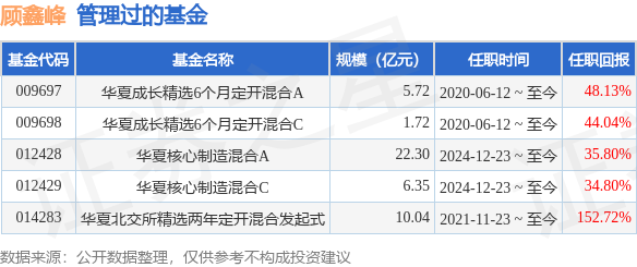 顾鑫峰先生:理学硕士。2012年7月加入华夏基金管理有限公司,曾任华夏基金管理有限公司投资研究部研究员,华夏资本管理有限公司投资经理、新三板业务部行政负责人,华夏基金管理有限公司股票投资部基金经理助理等。2020年6月12日起担任华夏成长精选6个月定期开放混合型发起式证券投资基金基金经理。2024年12月23日担任华夏核心制造混合型证券投资基金基金经理。