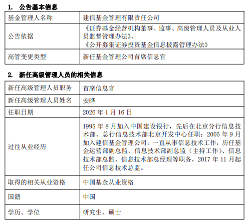 2026-01-21彩票,彩票平台,彩票网站,彩票APP下载,六合彩,快三近日,建信基金发布关于高级管理人员任职公告,宣布任命安晔为公司首席信息官,任职日期为2026年1月16日。此次任命填补了自2025年7月24日原副总裁、财务负责人兼首席信息官宫永媛离任后,该职位长达半年的空缺。