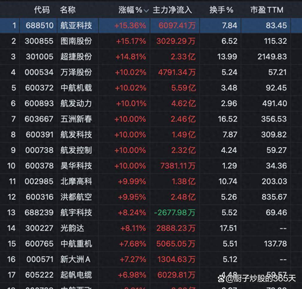 涨停名单拉出来,长长一串:做航空发动机叶片的航亚科技,暴涨15%;高温合金核心供应商图南股份,也涨了15%;做航空航天紧固件的超捷股份,涨14%。 万泽股份、中航机载、航发动力、航发科技、航发控制、昊华科技、北摩高科、洪都航空,这些名字一个接一个,全都涨了10%,封死涨停板。