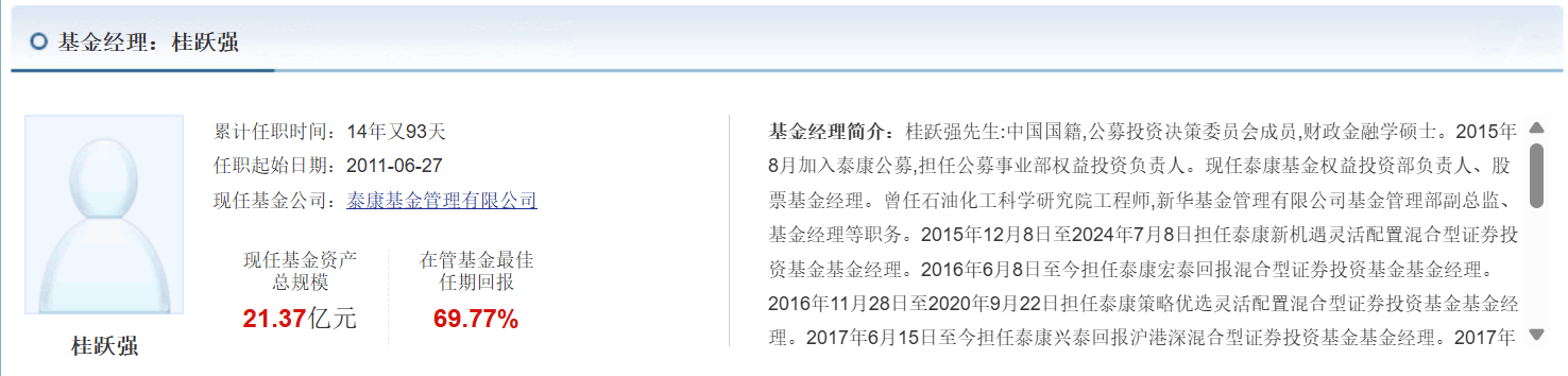 而能成为这场争议的核心,桂跃强并非无名之辈。公开资料显示,他拥有超14年公募投资经验,于2007年踏入公募行业,2015年8月加入泰康资产(泰康基金前身),现任泰康基金权益投资部负责人、股票基金经理,手握投资决策委员会委员话语权。在泰康基金的十余年中,桂跃强管理过15只公募产品,覆盖灵活配置、混合型、股票型等多个品类,累计管理规模曾达数十亿元,算是行业内履历光鲜的“老将”。
