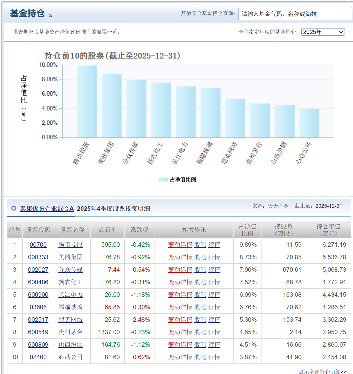 不过可惜的是,近年来,他的投资风格愈发僵化,尤其是独管的泰康优势企业混合,更是成为此次争议的核心标的。持仓上,泰康优势企业混合的重仓股堪称固化,前十大重仓股常年被腾讯控股、山西汾酒、美的集团、长江电力等传统价值股占据,对近一年的科技主线毫无布局,甚至在新能源等成长赛道也未见踪迹。