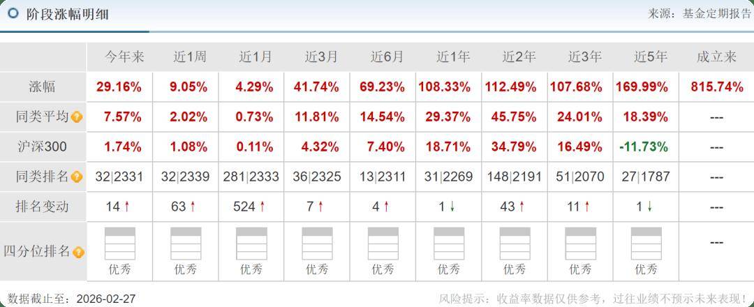 笔者发现,基金在2024年4季度买入6.74万股的赤峰黄金,2025年1季度持有5.81万股,2025年2季度持有9.04万股,2025年3季度持有45.76万股,2025年4季度持有143.03万股。在基金持有期间,在2024年10月9日-2026年2月27日股票价格上涨了99%。
