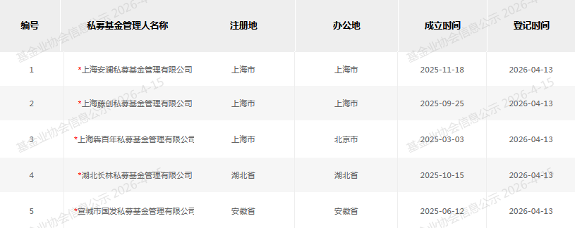 根据协会信息,4月13日完成的登记的5家私募管理人分别是上海安澜私募基金管理有限公司(以下称安澜私募)、上海藤创私募基金管理有限公司(以下称藤创私募)、上海犇百年私募基金管理有限公司(以下称犇百年私募)、湖北长林私募基金有限公司、宣城市国发私募基金管理有限公司。