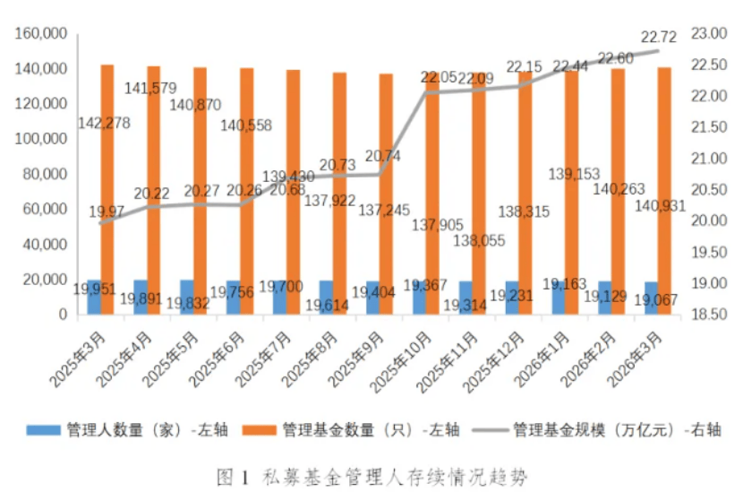 2026-04-22彩票,彩票平台,彩票网站,彩票APP下载,六合彩,快三4月20日,中国证券投资基金业协会发布了最新一期《管理人登记及产品备案月报》。数据显示,截至2026年3月末,私募基金存续总规模已达到22.72万亿元,再度创下历史新高。这已经是私募基金规模连续6个月创新纪录,显示出行业稳步扩张的势头。