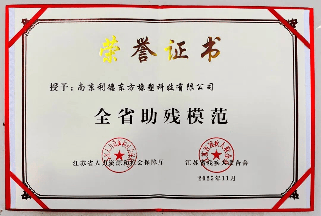 六合区企业“南京利德东方橡塑科技有限公司”获评省人社厅、省残联“全省助残模范(集体)”称号(南京市2家集体获评)。